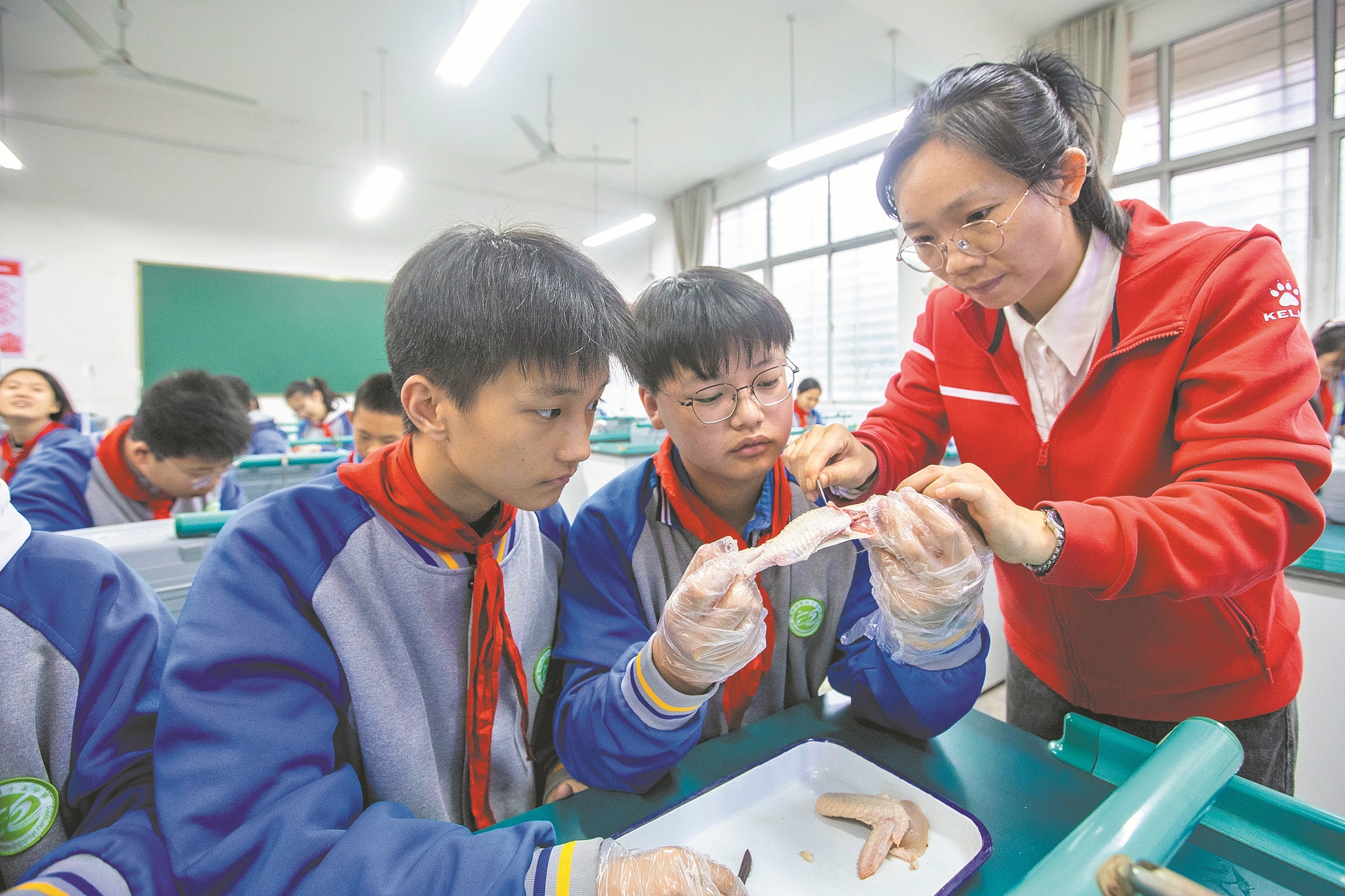 9月22日,市第四十五中学开展生物实践活动,教师带领学生解剖鸡翅。