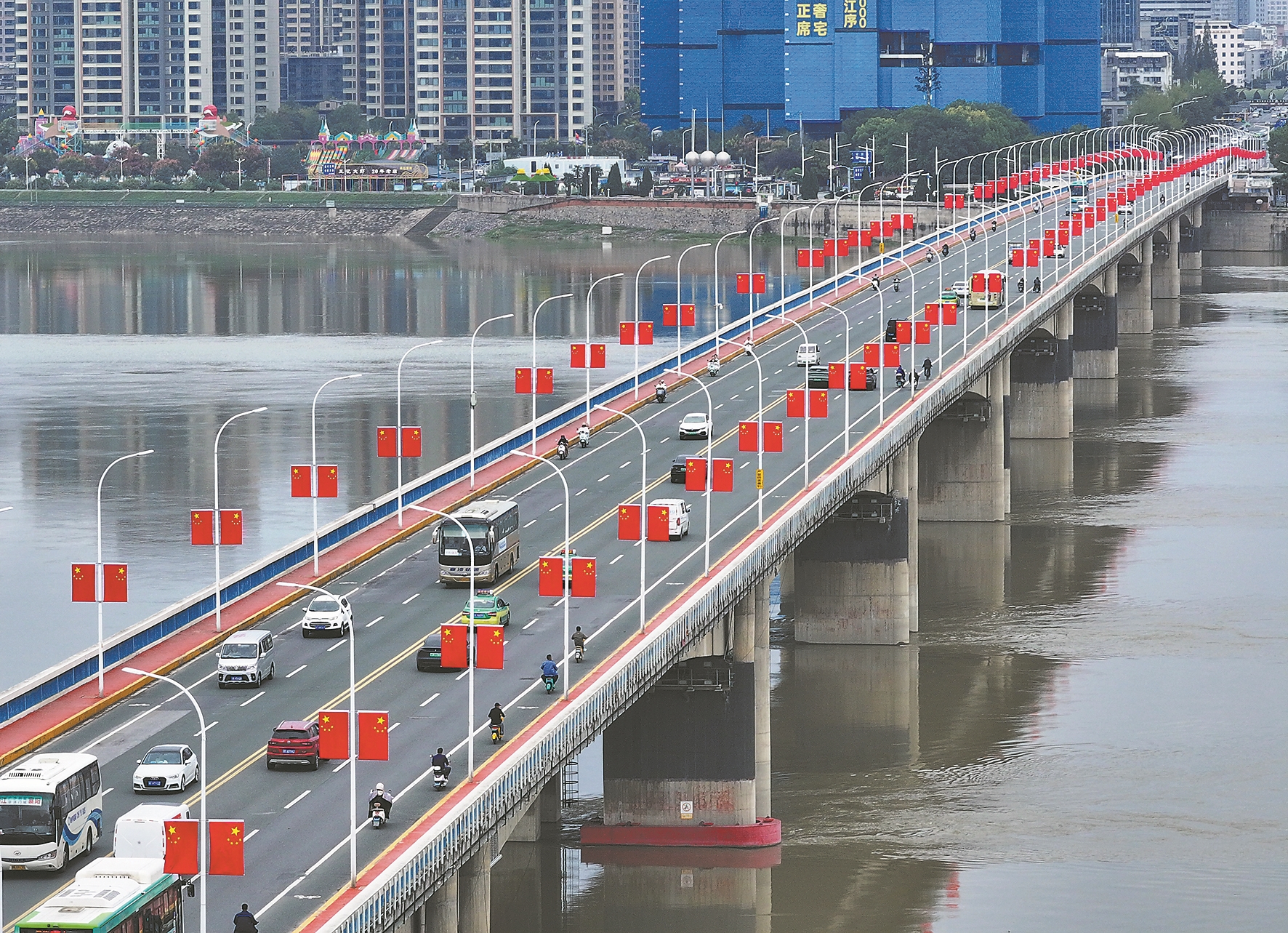 9月29日,汉江长虹大桥上悬挂起五星红旗。