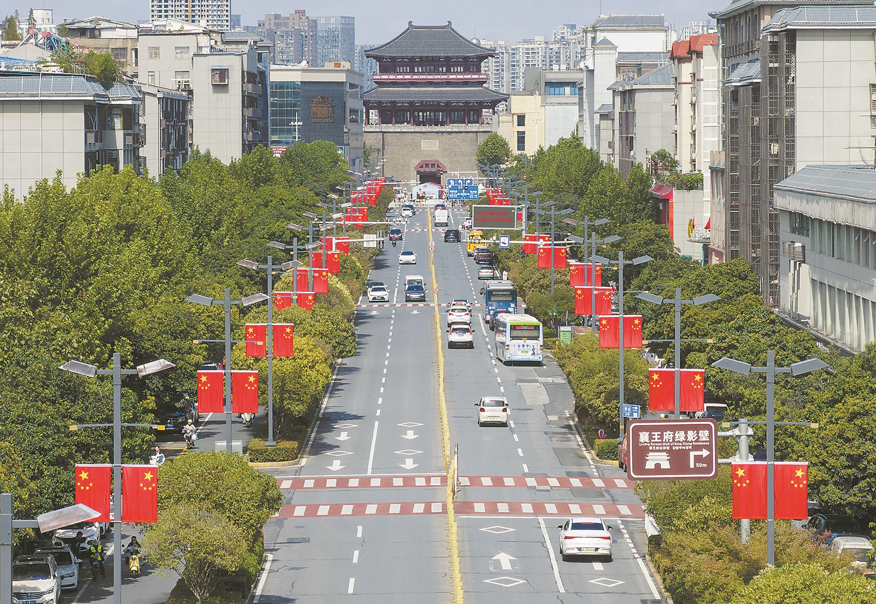 9月30日,襄阳古城悬挂鲜艳的五星红旗,喜迎国庆节。