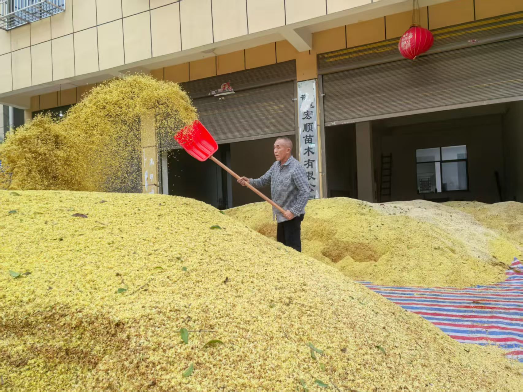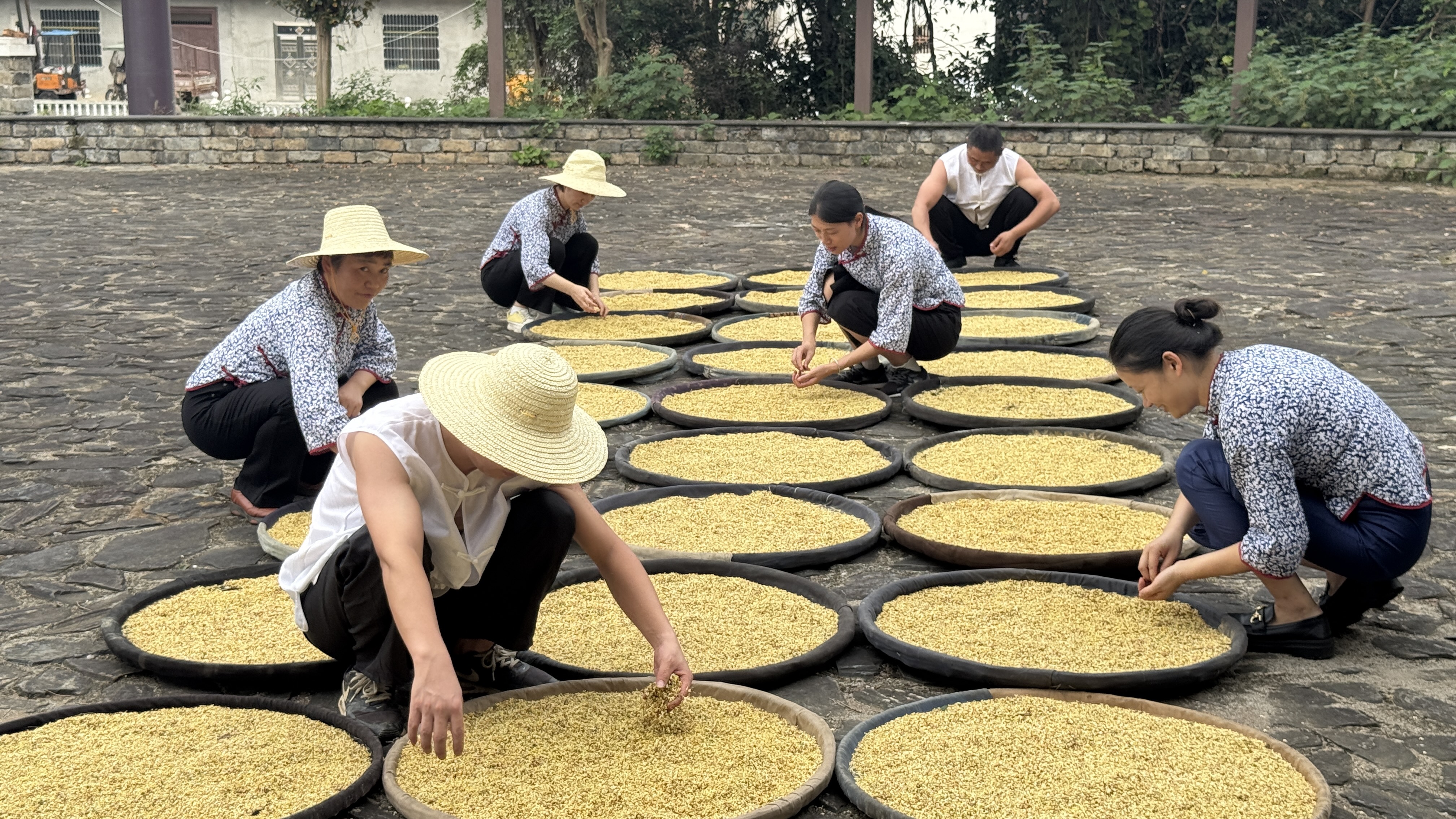 桂花镇S206省道旁的一公里街道上,更是一派繁忙景象。10多家收花商一字排开,满身沾着桂花粒的花农们排起长队,等着将新鲜桂花过秤变现。收花点里,有的老板现场用盐腌制桂花,有的直接烘干处理,还有的将桂花装车,送往红牛、金桂生物等企业。据了解,各收花点每天收花量达万斤左右。