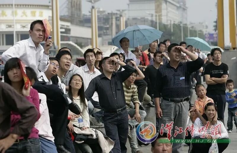 2009年10月1日上午,在襄樊火车站广场,市民通过户外电视大屏幕收看国庆阅兵式直播。