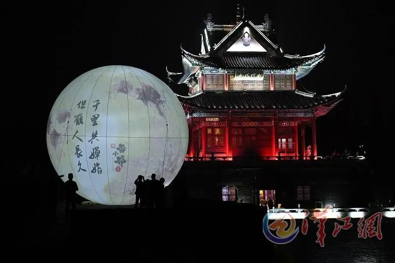 2017年国庆、中秋期间,我市持续降雨,市民在仲宣楼欣赏人造月亮。记者安富斌摄