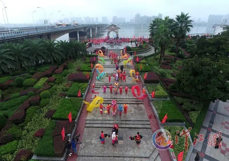2017年10月1日,市民在汉江边的广场上载歌载舞,庆祝新中国68岁华诞。当日,中央电视台现场直播了我市开展的喜庆锣鼓、划旱船、广场舞、畅游汉江等文化体育活动。记者谢勇摄