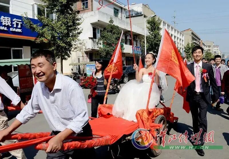 2012年“十一”期间,在南漳县,一位新郎用板车迎娶新娘。