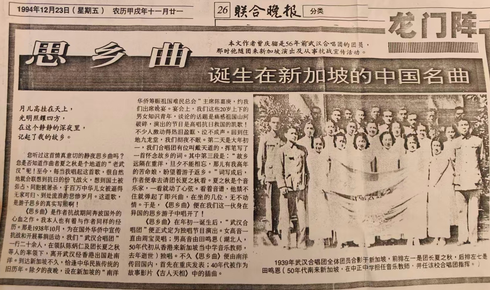 成立于1937年11月的武汉合唱团,在抗日救亡运动中,以传播抗战歌曲为使命。除了《思乡曲》,团长夏之秋还创作了《歌八百壮士》等抗战歌曲,传唱一时。1938年,随着战局变化,武汉危在旦夕,武汉合唱团的28名团员,决定抛家舍业,赴南洋开展演赈活动。