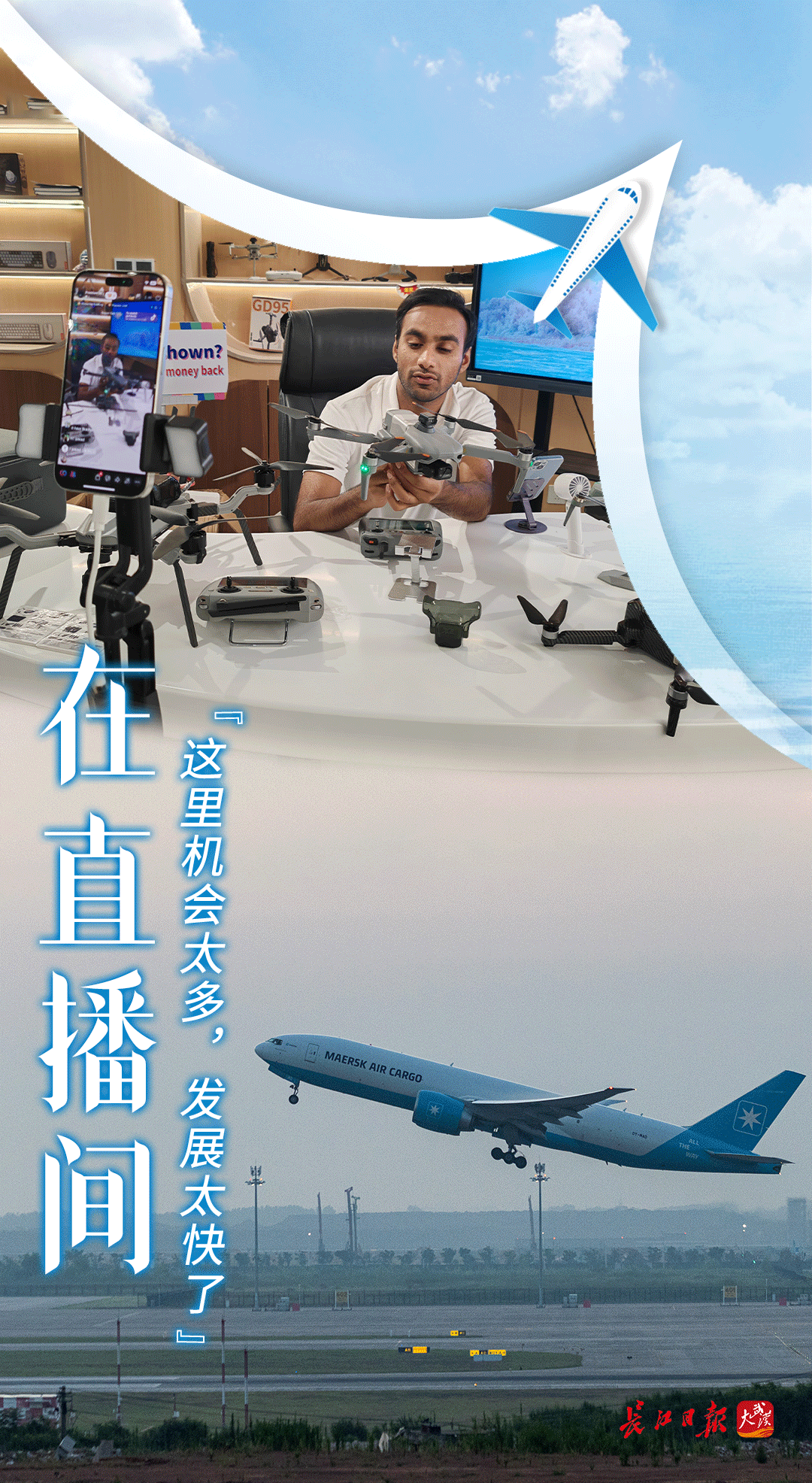 离花湖机场仅10分钟车程的中国(鄂州)跨境电商产业园里,23岁的巴基斯坦小伙阿布坐在镜头前。他手拿无人机,用流利的英语向美国消费者热情推荐。这个6月才开播的直播间,如今日均销售额已稳定在4000美元。