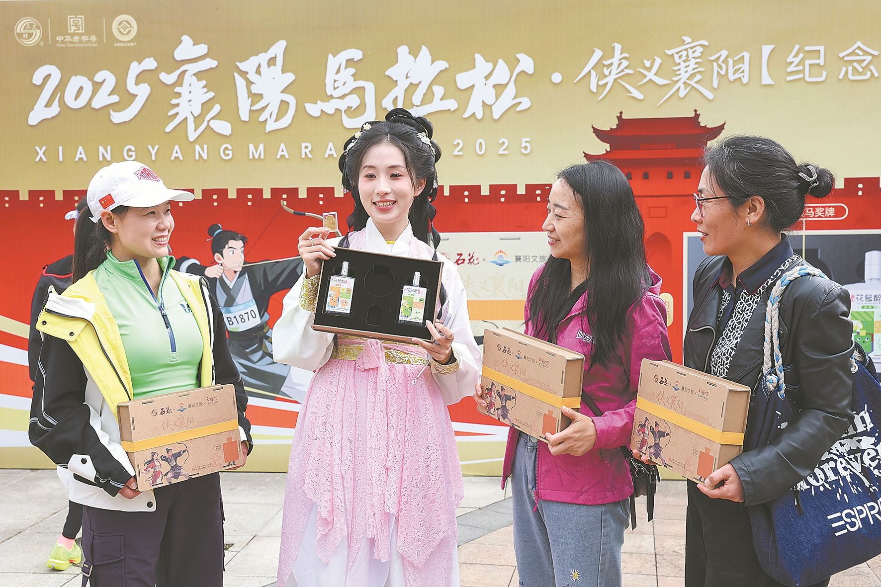 10月11日,在襄阳全民健身中心,襄阳马拉松赛事高级赞助商石花酒业向中签跑友发放2025襄马“侠义襄阳”礼盒。礼盒外观包含武侠元素,内置石花酒业“花茗醉”露酒两瓶、“侠义襄阳”纪念金贴(金贴足金999,重约2mg)一枚,并预留空槽供跑友放置完赛奖牌。