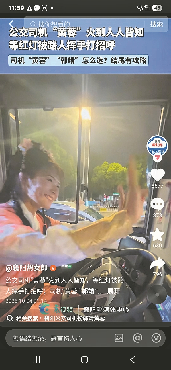 视频简介:10月4日,汉水襄阳、襄阳帮女郎等抖音号发布题为《“侠义襄阳”主题公交火爆出圈,公交司机化身郭靖黄蓉NPC带你解锁襄阳武侠梦》的报道。