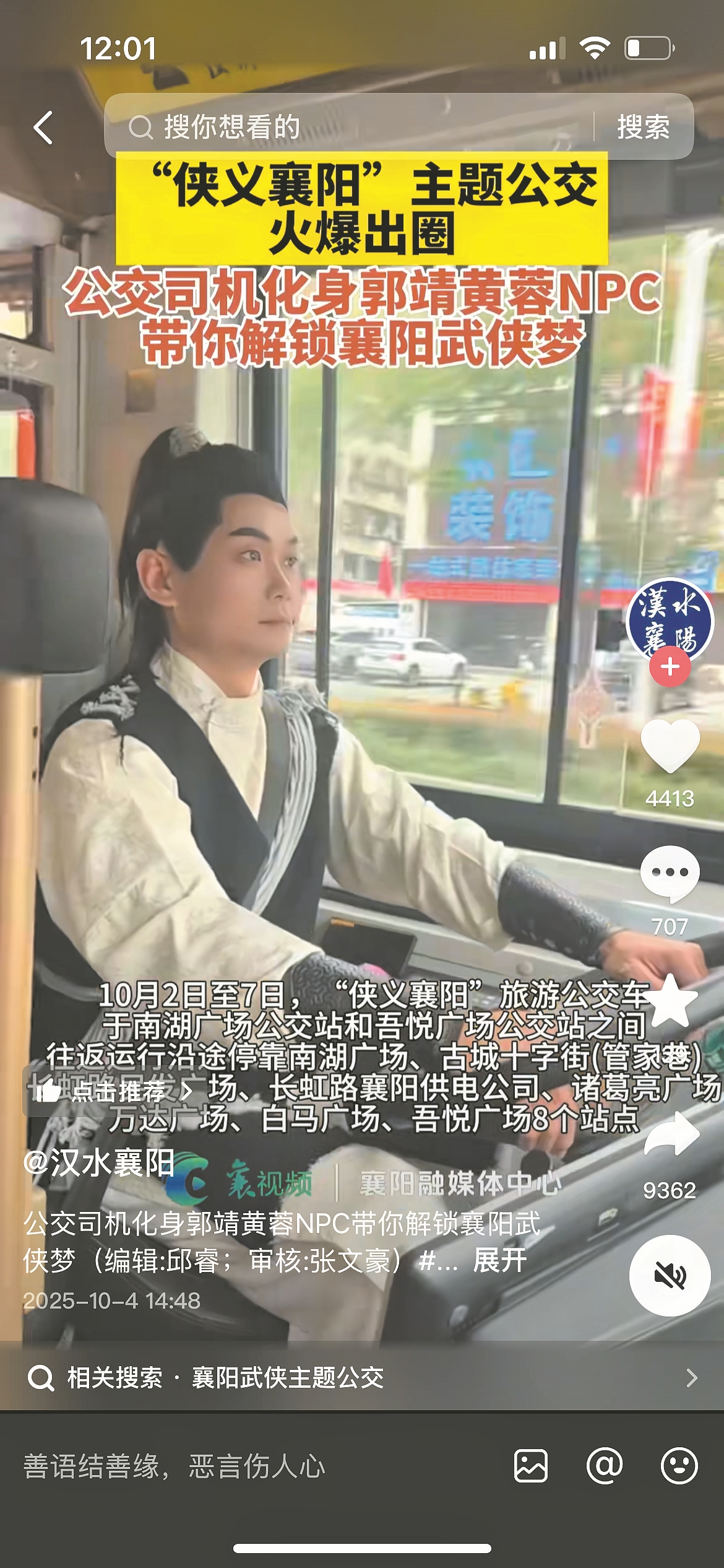 10月4日,汉水襄阳、襄阳帮女郎等抖音号发布“‘侠义襄阳’主题公交火爆出圈,公交司机化身郭靖黄蓉NPC带你解锁襄阳武侠梦”的报道。