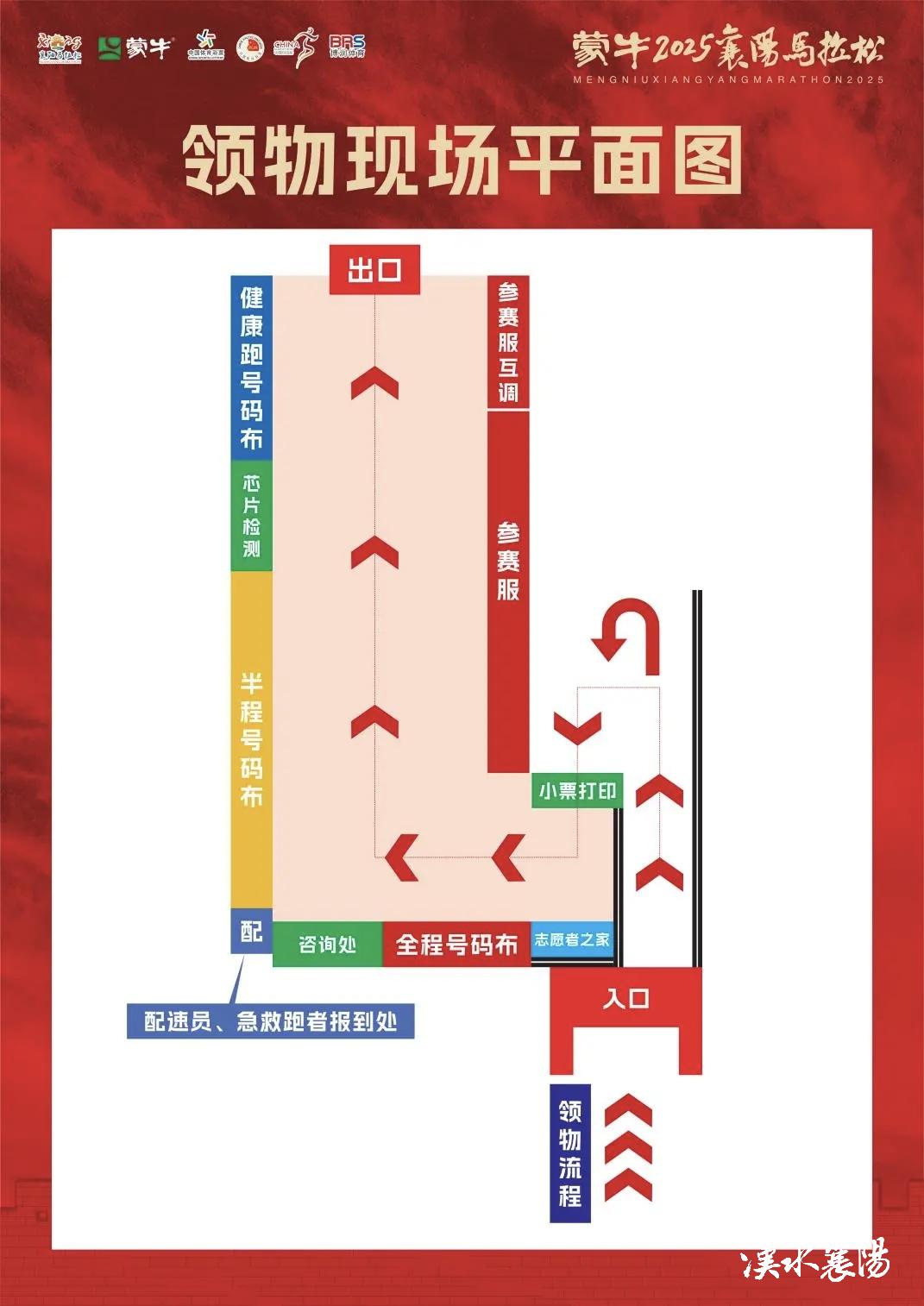 领物点设在樊城区长虹北路16号诸葛亮广场诸葛亮像旁,领取时间为10月17日10时至19时,18日9时30分至21时30分,选手本人持身份证或其他有效证件领取。襄马参赛物资包括号码布、参赛服、牛奶、麻花、芝麻丸、啤酒、羽衣甘蓝特色饮品、纸巾、盲盒礼品卡、一次性雨衣及开箱彩蛋。参加马拉松、半程马拉松比赛的选手,参赛物资中还有能量胶和盐丸。