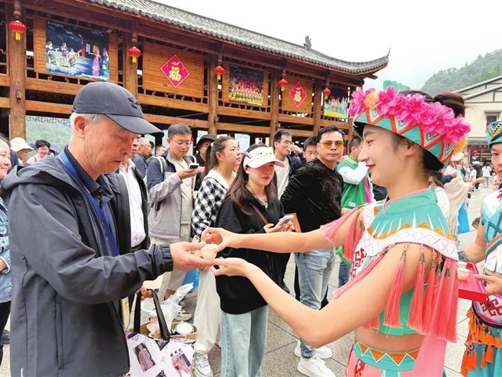 10月2日,长阳歌舞剧团演员与游客奉茶互动。 通讯员 杨金艳 摄