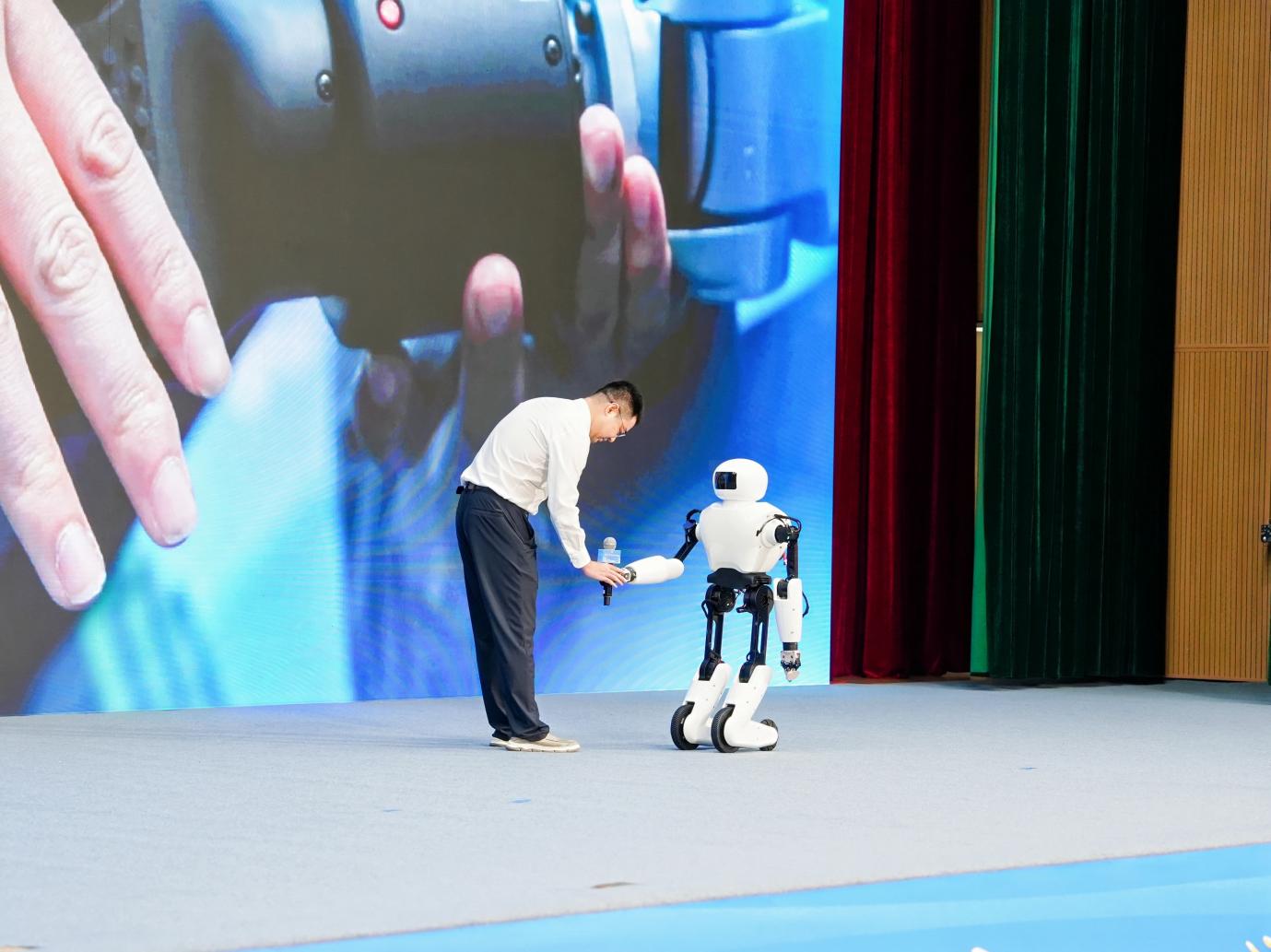 “荆楚”人形机器人递上话筒。