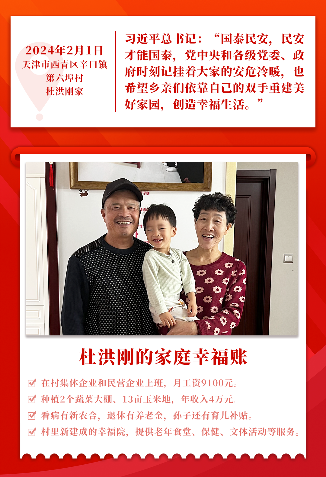 同样遭遇特大洪水灾害的,还有天津市西青区辛口镇第六埠村村民杜洪刚。2024年2月1日,习近平总书记到他家走访时,一笔一笔算灾情损失和灾后生产发展、就业增收账。