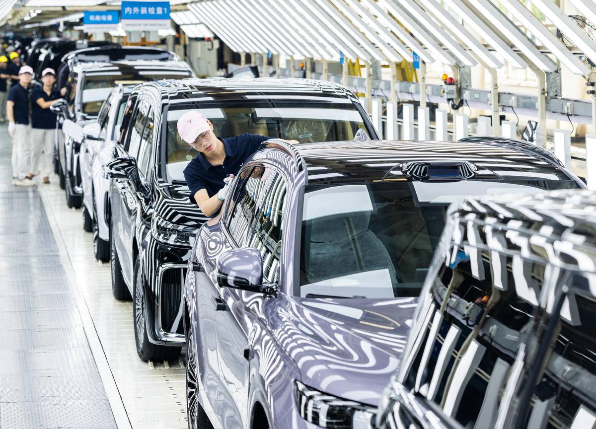 岚图汽车总装车间内,工人在流水线上作业,一辆辆新能源汽车驶下生产线。(湖北日报全媒记者 薛婷 摄)