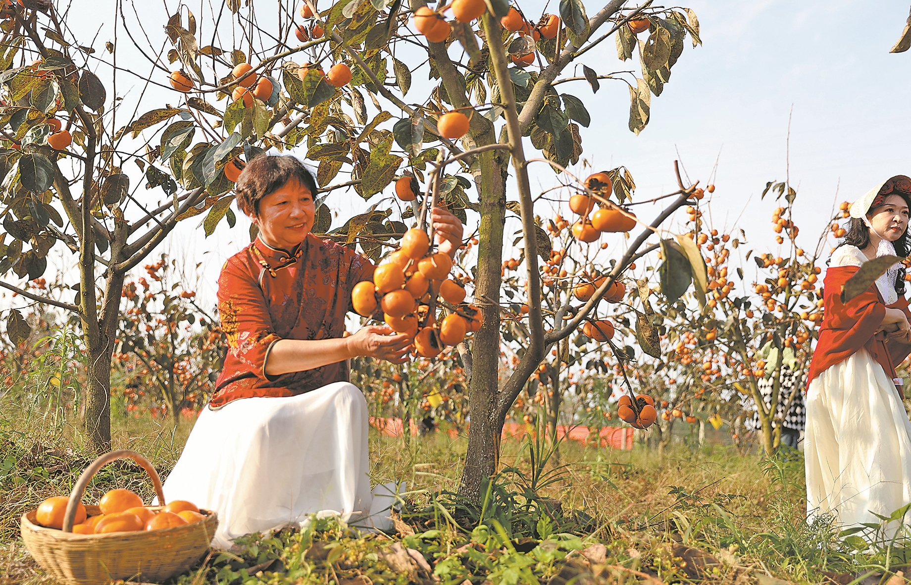 10月26日,长寿岛国家湿地公园里,橙红色的柿子挂满枝头,吸引众多市民前来采摘、拍照,构成一幅美丽的秋日丰收图景。