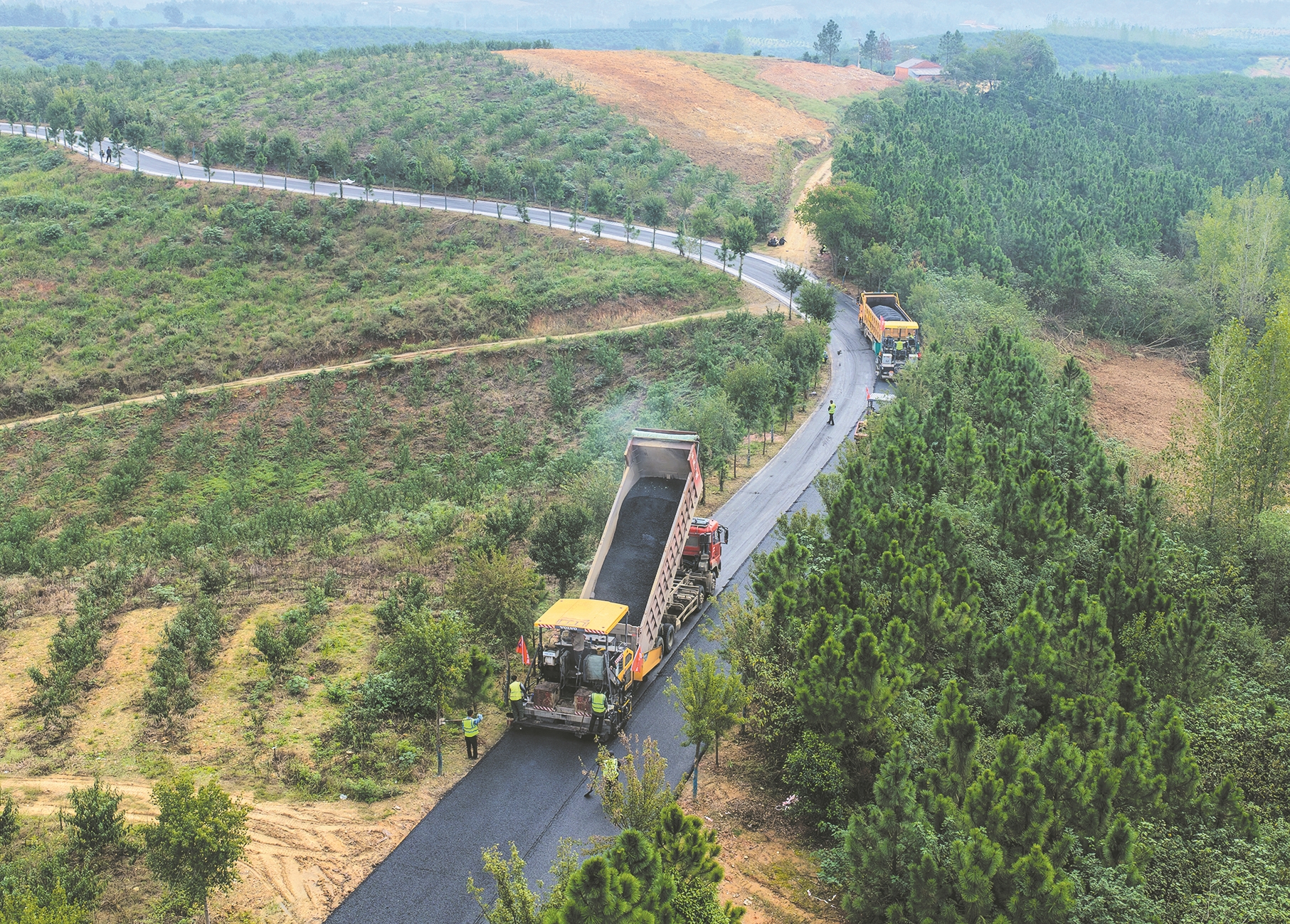 10月25日,工程车在枣阳市白龙路提档升级项目现场铺设沥青。