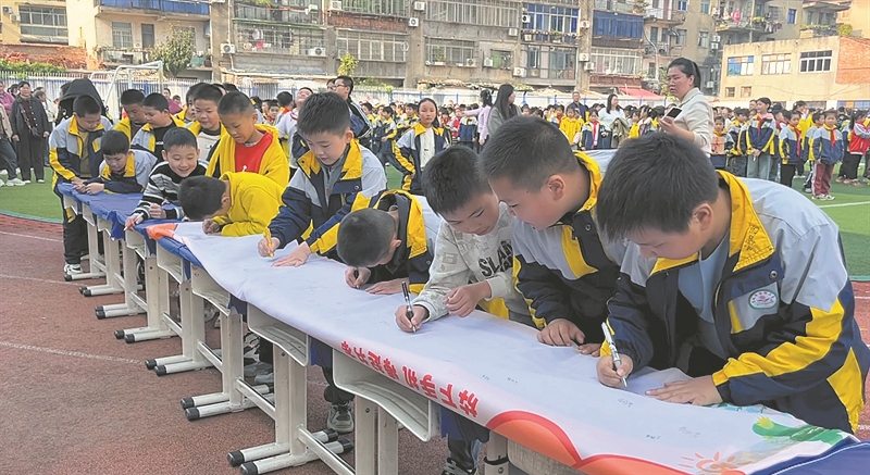 近日,宜城多所学校创新活动方式,引导学生脱离手机,推行“放下手机”常态化活动。图为10月29日,宜城西街小学举办“放下手机,拿起书本”签名活动。