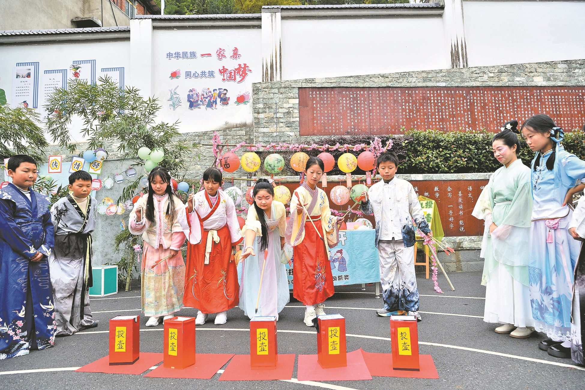 10月31日,在保康县城关镇小学诗韵雅集游园会“诗礼投壶轩”摊位上,学生们正在体验投壶。当天,该校举办了一场别开生面的诗韵雅集游园会,通过“游园闯关+艺术创作+汇演实践”的方式,让学生们在趣味互动中感受传统文化的魅力。特约通讯员 杨韬 通讯员 余夕雯 李兆忠 摄