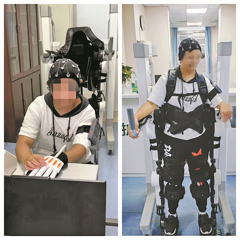 每天训练时,李先生都会戴上一顶布满传感器的脑电设备。“它不像冰冷的器械,更像轻便的‘思维帽’。”他说,只要集中精神想象抬腿动作,系统就能精准识别意图,带动外骨骼完成动作。该院康复医学科主任詹燕解释,这项技术的突破之处在于绕开患者受损脊髓通路,直接建立“大脑-机器-肢体”的协作,既提供物理支撑,又能促进神经功能重塑。