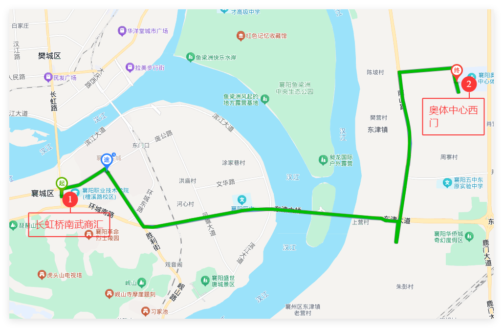 襄州方向定制返程路线:由奥体中心发车后,经东津民发世纪广场、襄州区政府、航空路长安市场、金富士路口(民发广场)、航空路汉津路口到达清河桥东终点站。