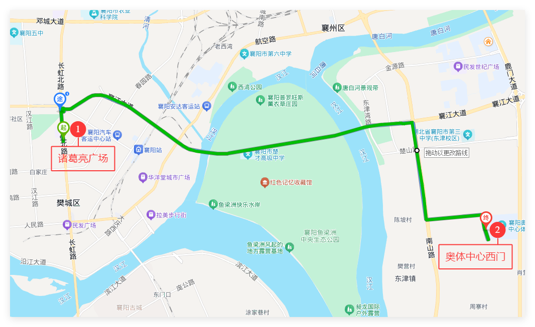 由长虹桥南武商汇(原襄城客运站)发车,沿途停靠长虹南路武商汇、古城十字街、南湖广场、胜利街4个站点。全程35分钟,根据实时客流发车。