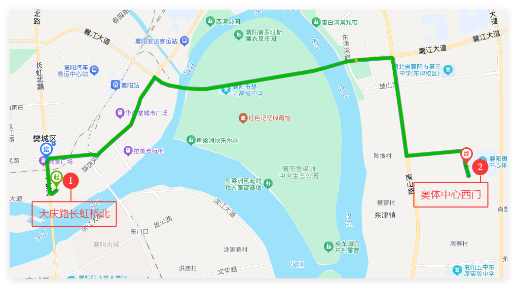 樊城方向返程定制路线:由奥体中心发车,行驶至鱼梁洲隧道后经大庆路、人民路、长虹路、中原路到达襄阳火车站;