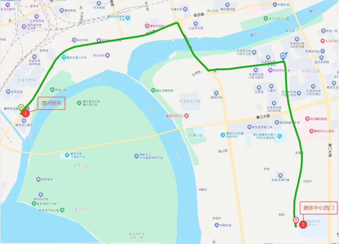 由清河桥东发车,沿途停靠航空路汉津路口、金富士路口(民发广场)、航空路长安市场、襄州区政府、东津民发世纪广场6个站点。