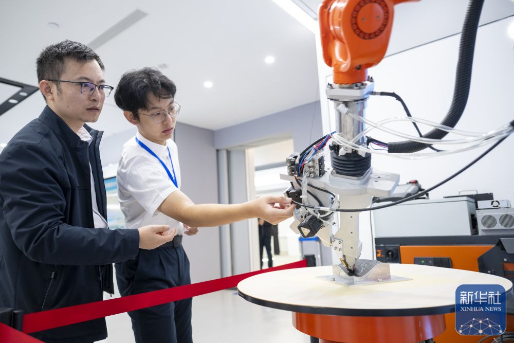 ↑11月6日,在武汉产业创新发展研究院,工作人员展示增材制造机器人。新华社记者 伍志尊 摄