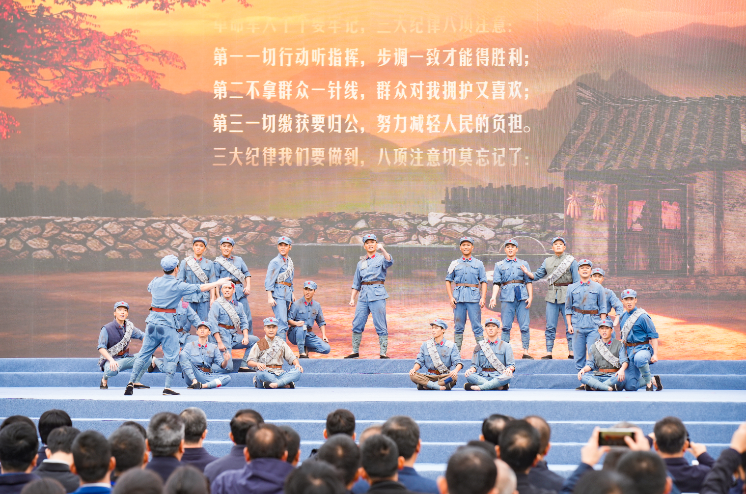 11月8日下午,在宣化店镇河西村突围广场,由武汉传媒学院师生创排的行进式红色情景剧《1946中原突围》正在首演,该剧以“实景还原、互动沉浸、专业协同”的创新表达,让70多年前的革命历史走进现实,引得数百名旅游者凝神观看。