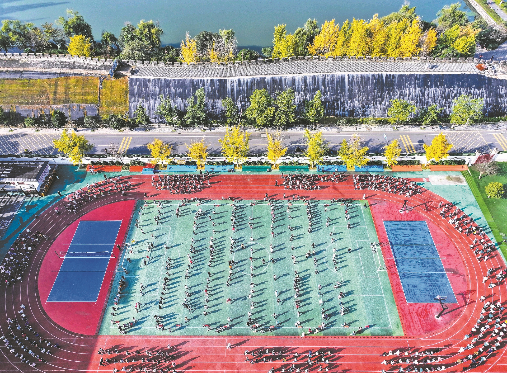 11月11日,市昭明小学学生在操场上跑步。