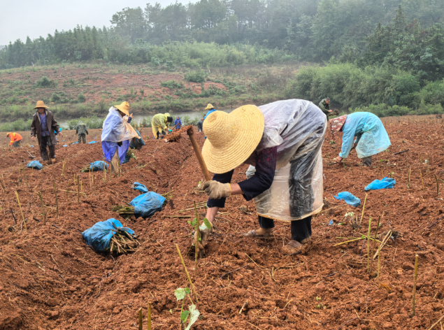 双溪桥镇李沛村的丘陵山地上,新栽的苎麻苗顺着山势铺展,在冬日的黄土地上扎下坚实的根。连日来,红源苎麻种植专业合作社的50余名村民正在地里忙碌着。