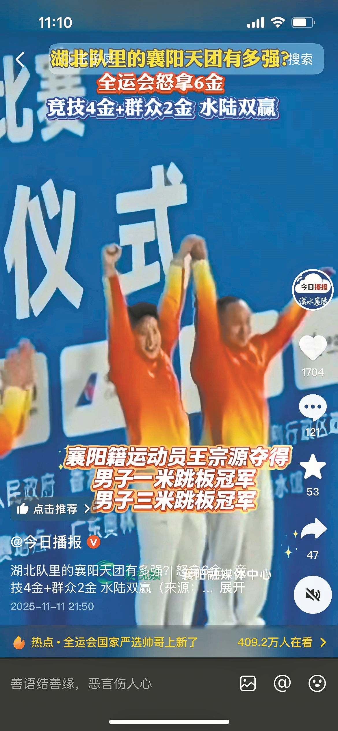 在第十五届全运会的赛场上,襄阳健儿表现抢眼、捷报频传。截至11月11日,襄阳选手已豪取六枚金牌,其中奥运冠军王宗源在跳水项目中再度展现绝对实力,为家乡添彩。11月17日,游泳老将闫子贝与队友协力出战,勇夺男子4×100米混合泳接力赛冠军,为湖北代表团再添一金!