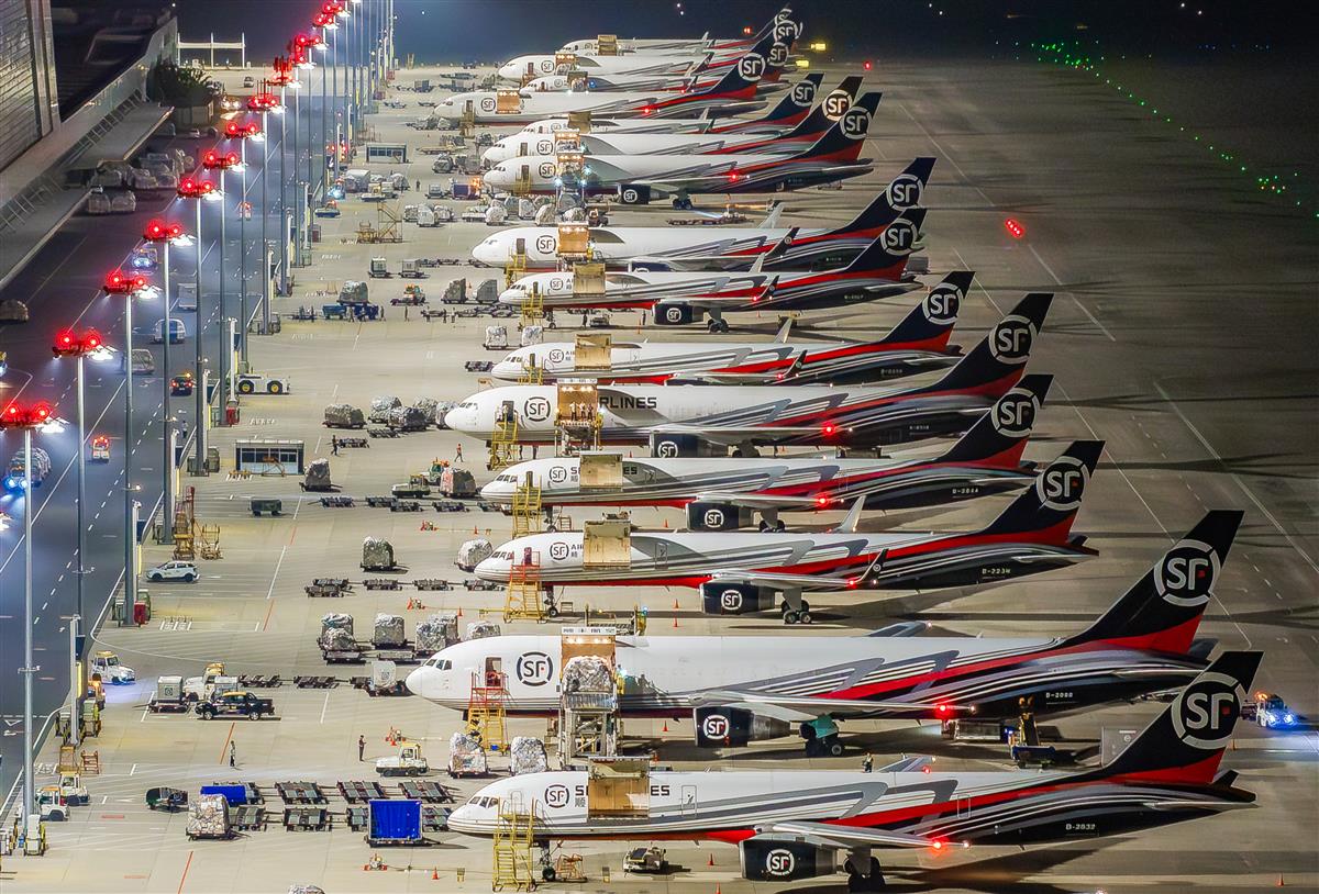 夜幕降临,鄂州花湖国际机场的跑道上,灯火璀璨,近百架次货机起降。
