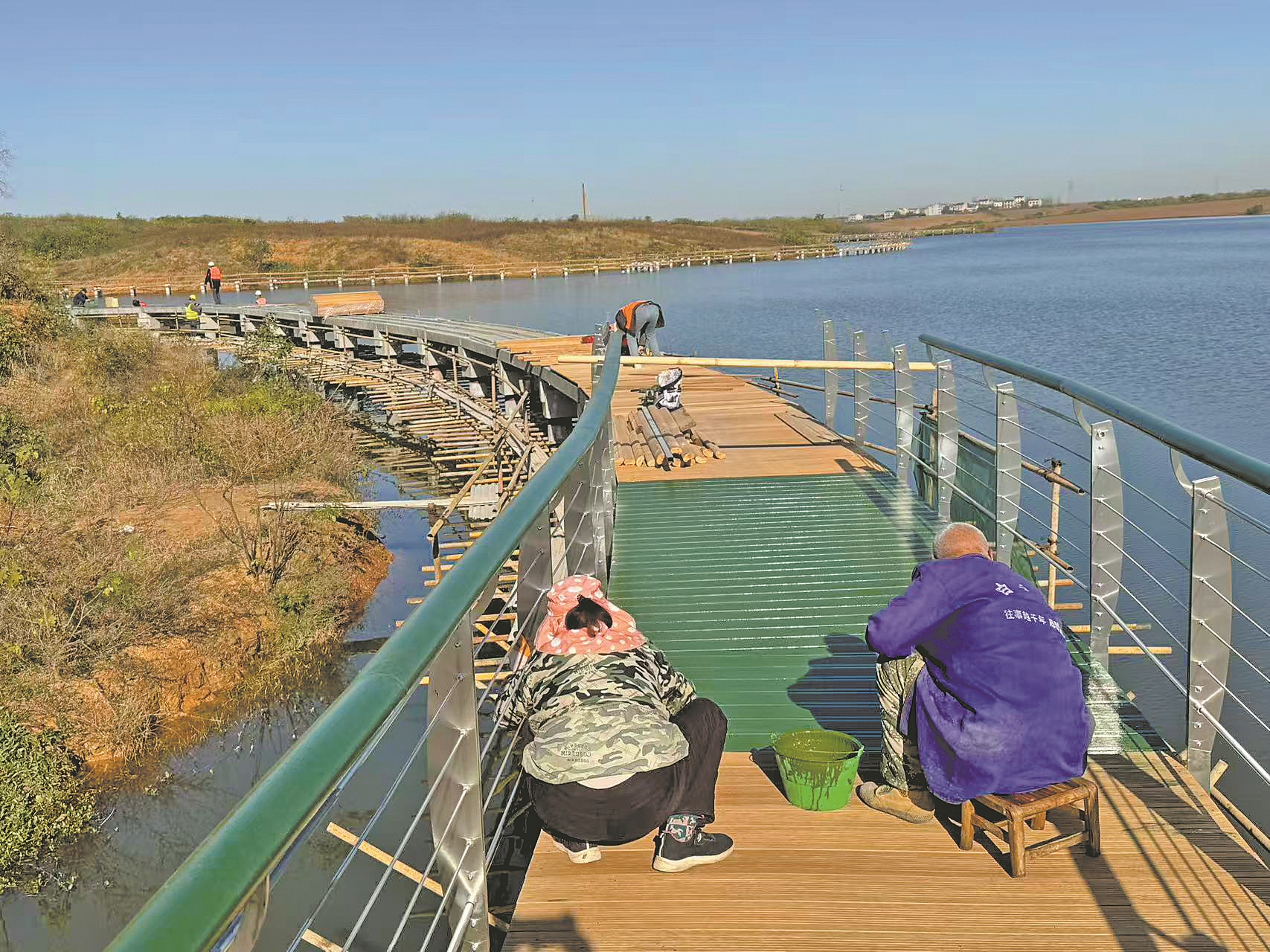 11月25日,普陀堰水库景观栈道正在施工。该栈道位于普陀堰水库西侧,宽2米、长1.6公里,采用全预制构件工厂化加工,现场组装。栈道地面采用塑木材质,兼顾美观及耐久度,建成后将成为水库边的景观带。