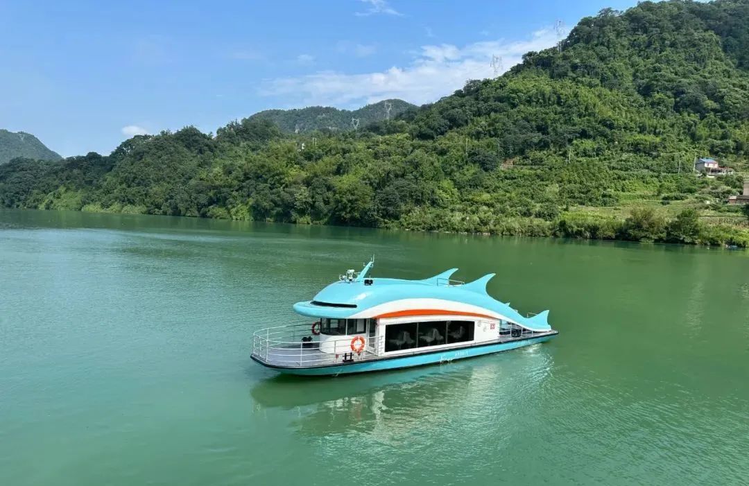 在长阳白石雄关水域,江豚外形的新能源电动客渡船“清淼2号”即将迎客,该船快充2.5小时、续航超6小时,相比传统燃油动力船舶,每年可减碳约50吨。
