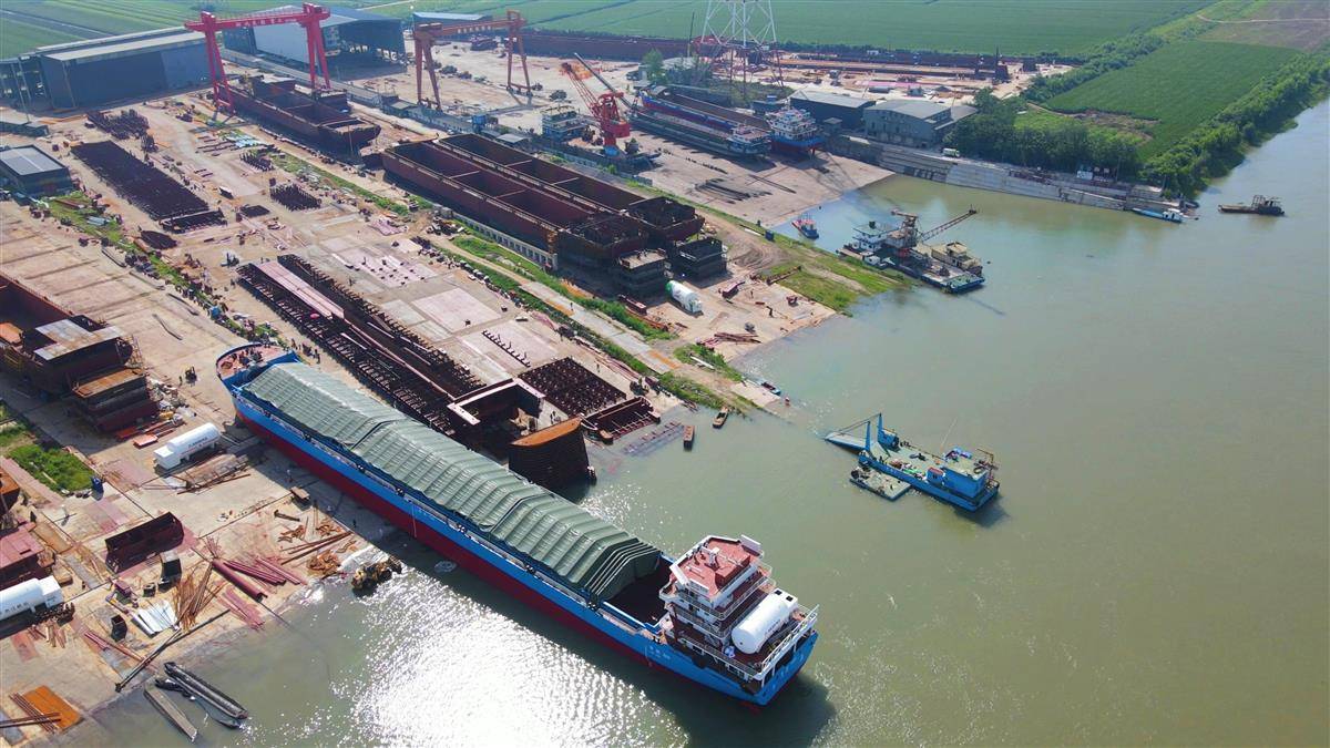7月1日,由湖北东船重工有限公司建造的LNG(液化天然气)新能源船舶“景鹏1009”在枝江顺利下水启航。图片来源:枝江市七星台镇