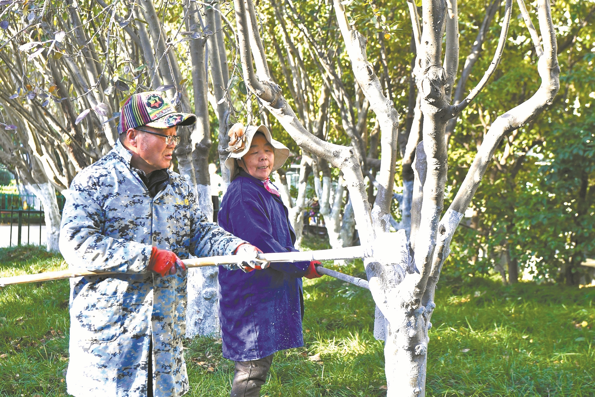 11月26日,在樊城区人民公园,园林工人开展涂白作业,为园区树木穿上“防护衣”,保障树木安全过冬。