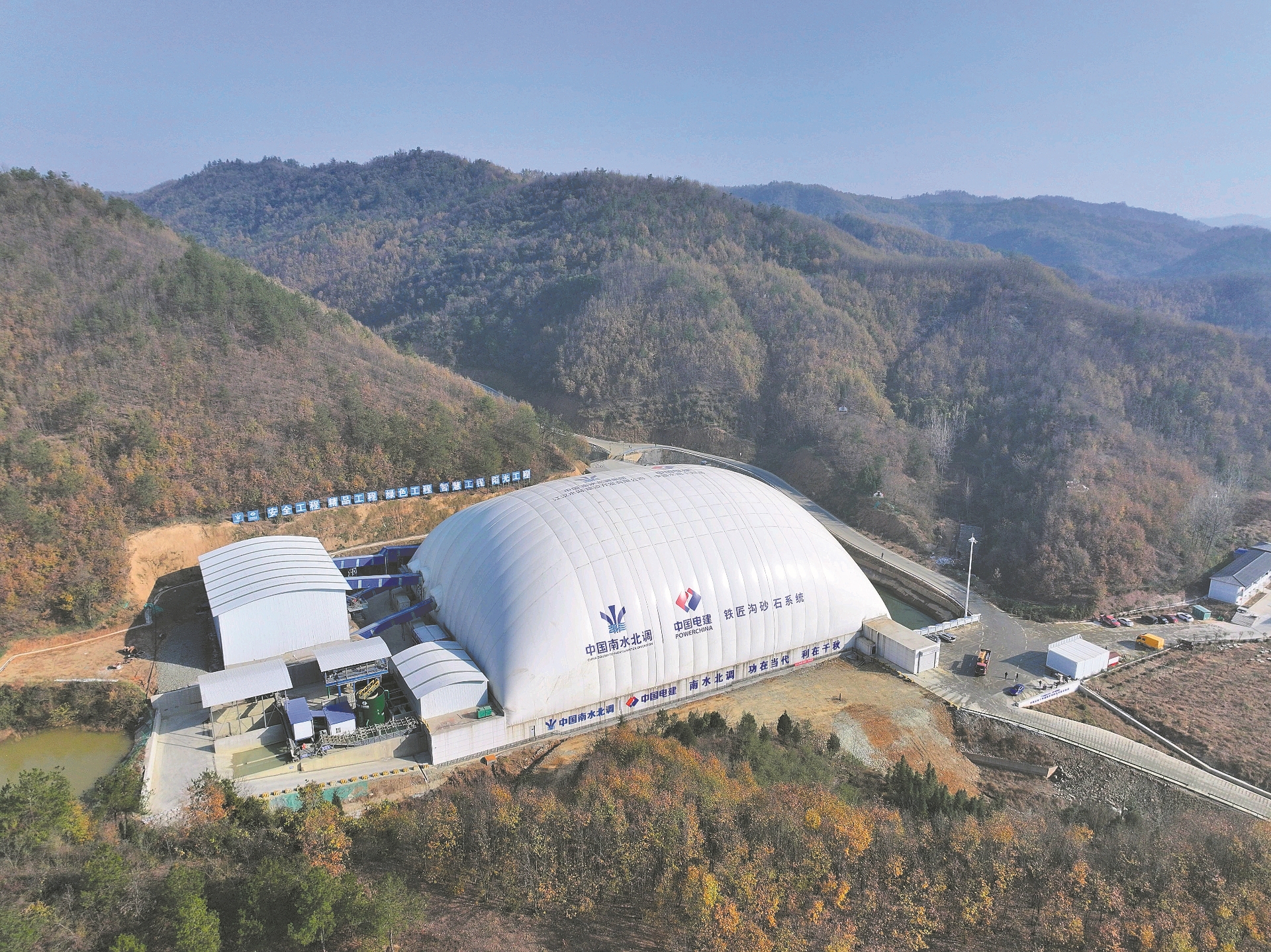12月3日,位于谷城县五山镇的引江补汉工程铁匠沟砂石系统气膜大棚内正在生产砂石骨料。铁匠沟砂石系统主要承担引江补汉工程砂石骨料加工任务,生产能力达500吨/小时。气膜建筑采用特殊建筑膜材料作为外壳,借助智能化风机设备维持内部正压,施工过程实现零污染、低能耗,切实践行了“绿色生产”理念。 全媒体记者谢勇 摄