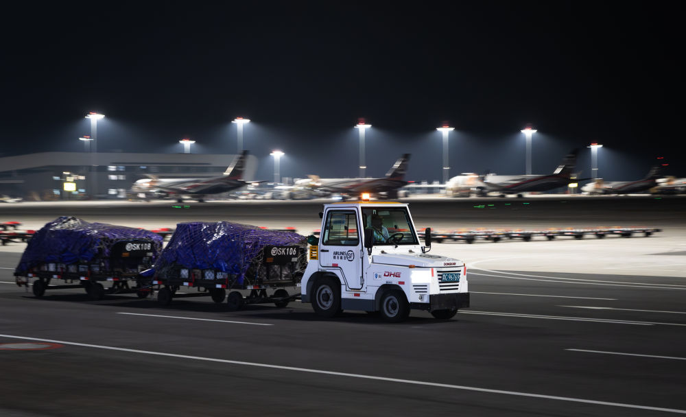 子夜时分,记者驱车来到这座机场时,扑面而来的是一派“不夜空港”的繁忙景象:雪亮的停机坪上,货机刚一停稳,工作人员便操控牵引车、加油车、转运车簇拥而上,卸货、加油、检查,井井有条,一刻也不耽误。