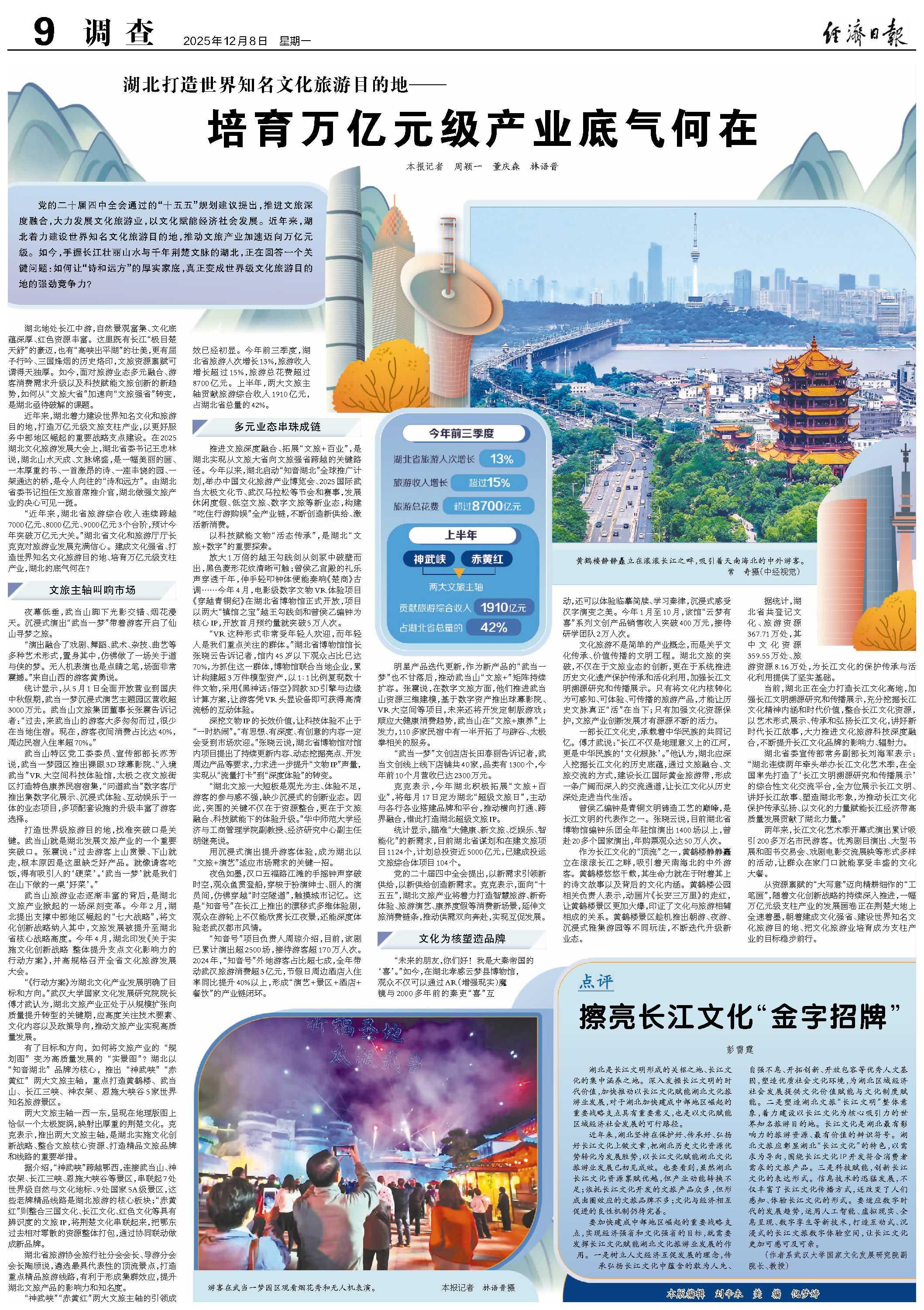 党的二十届四中全会通过的“十五五”规划建议提出,推进文旅深度融合,大力发展文化旅游业,以文化赋能经济社会发展。近年来,湖北着力建设世界知名文化旅游目的地,推动文旅产业加速迈向万亿元级。如今,手握长江壮丽山水与千年荆楚文脉的湖北,正在回答一个关键问题:如何让“诗和远方”的厚实家底,真正变成世界级文化旅游目的地的强劲竞争力?