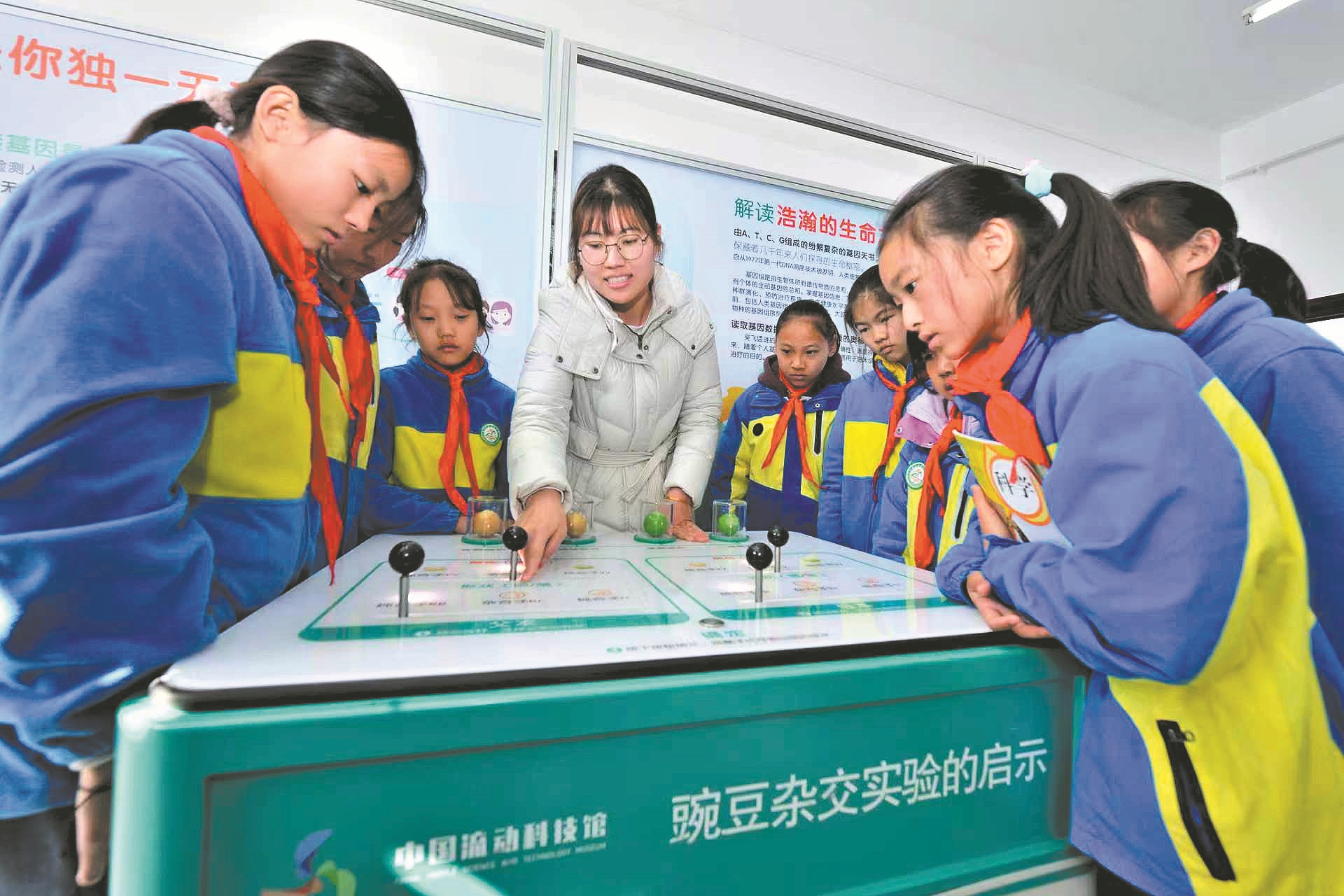 近日,在保康县歇马镇小学“流动科技馆”,教师指导学生体验科技展品。日前,中国流动科技馆湖北省区域襄阳市保康站巡展走进歇马镇小学,让学生们“零距离”学习科技知识,感受科技趣味,接受科普教育。