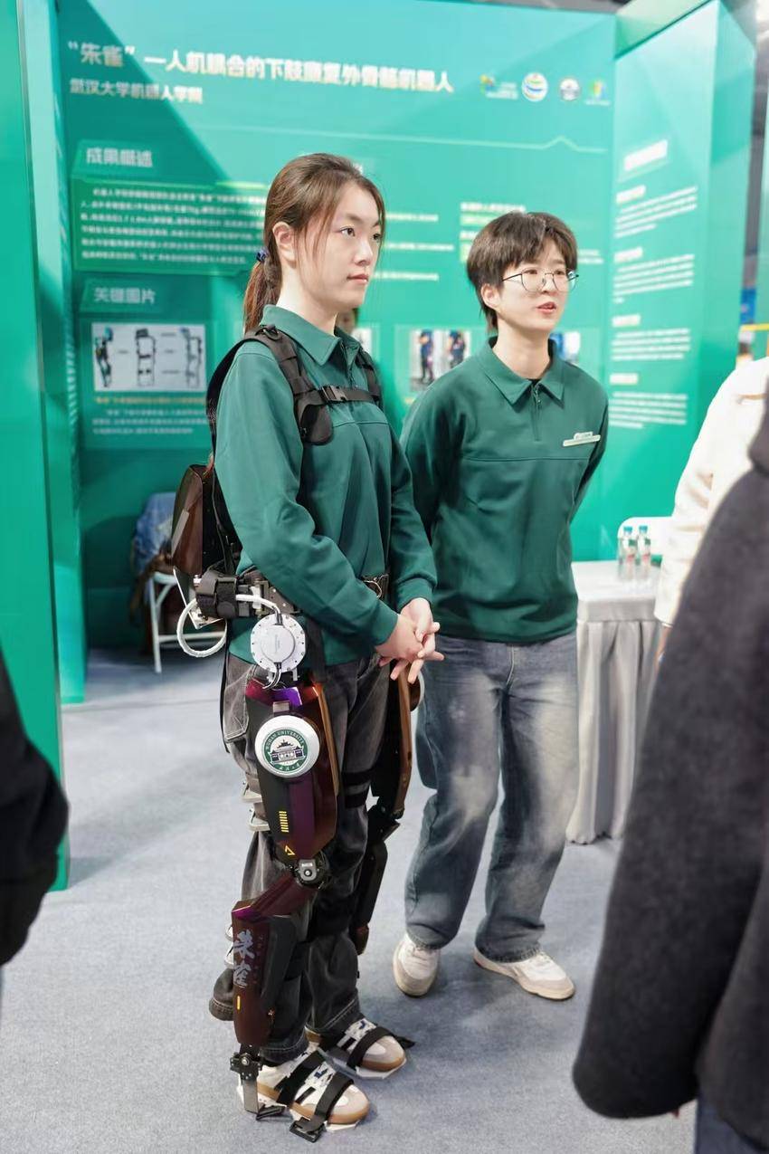 武汉大学机器人学院团队带来“朱雀”下肢康复外骨骼机器人(湖北日报全媒记者 严芳婷 摄)