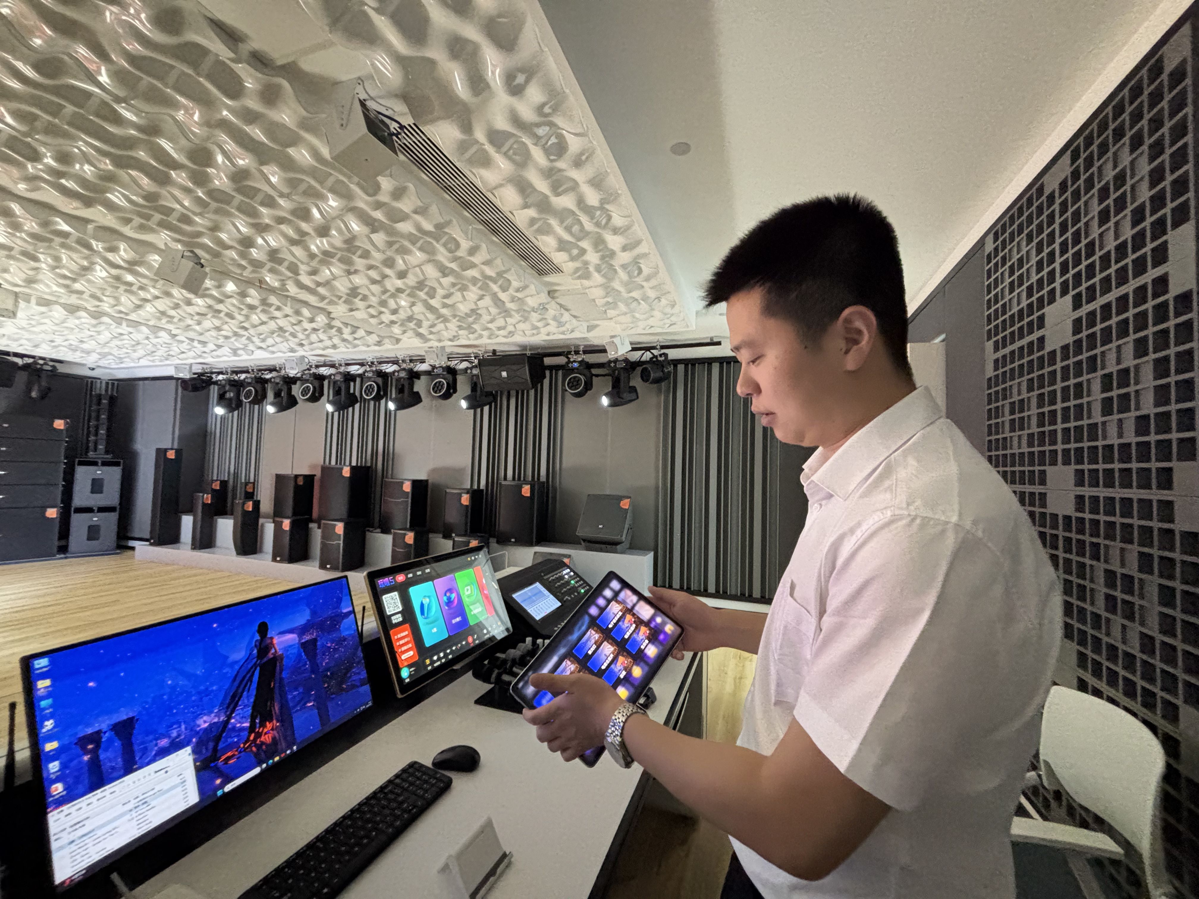 保伦电子研发的声光影平台产品只需要手持平板电脑,轻点屏幕,一键即可完成整个场景的声光电控制。栾嘉雯 摄