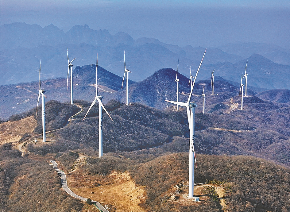 12月11日,保康县后坪镇横冲风力发电场,大型风力发电机组正迎风发电。