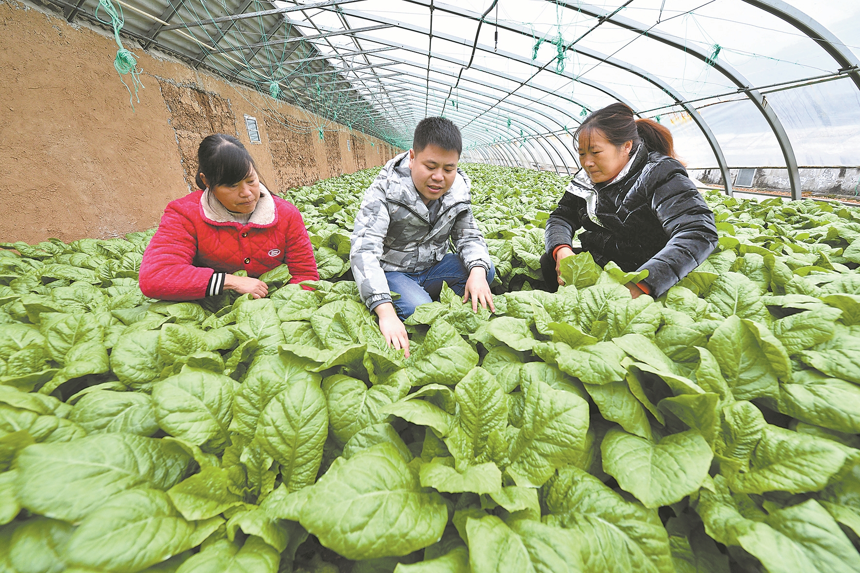 12月12日,在保康县寺坪镇庹家坪村蔬菜种植基地,保康县农业农村局农技人员(中)为菜农讲解蔬菜防寒管理技术。