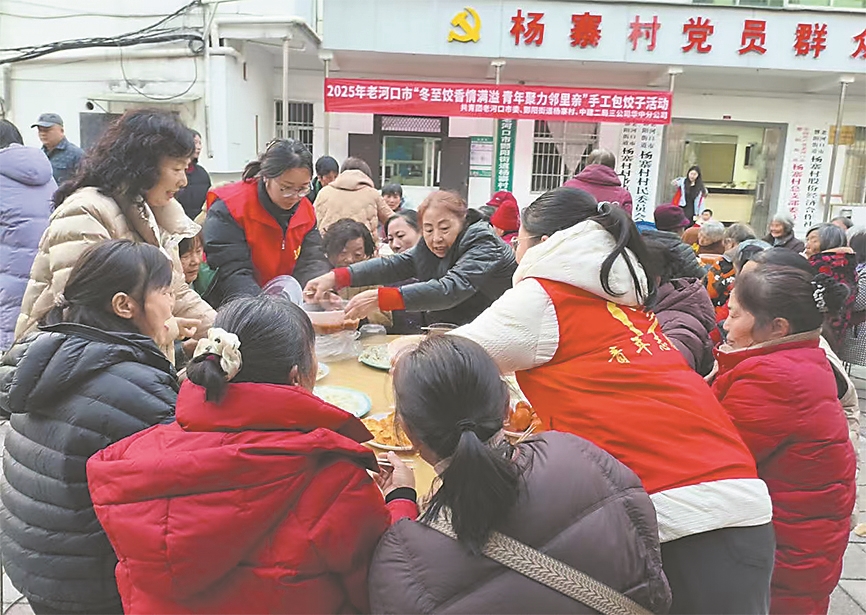 12月17日,老河口市酂阳街道杨寨村村委会院内,饺香四溢、笑语不断。一场由共青团老河口市委、杨寨村村委会以及中建二局三公司华中分公司联合举办的“冬至包饺子”活动在这里热闹举行。