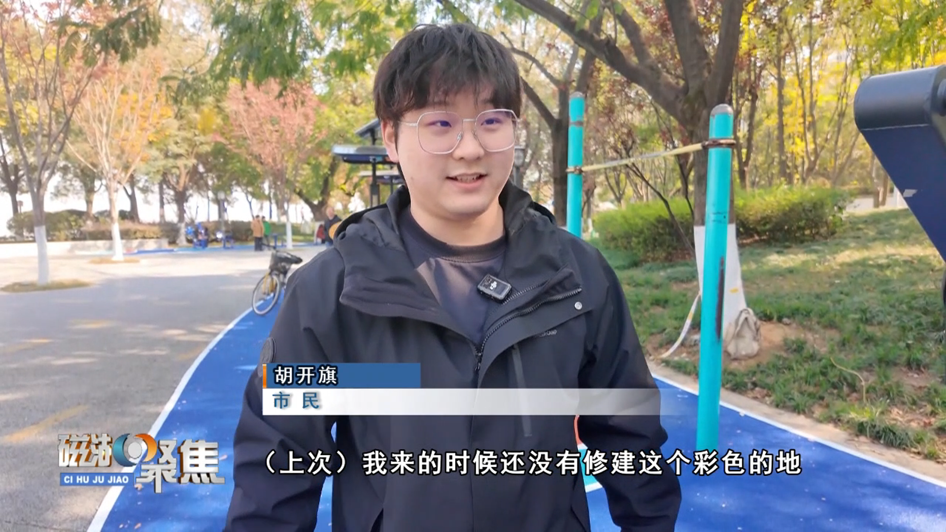 市民 胡开旗:我上次是月初来的,(上次)我来的时候还没有修建这个彩色的地,这一次我来的时候我发现这个地,全部都变成新的了,非常漂亮。我看了下,这边健身器材非常齐全,如果住在附近的居民随时下楼就可以玩。