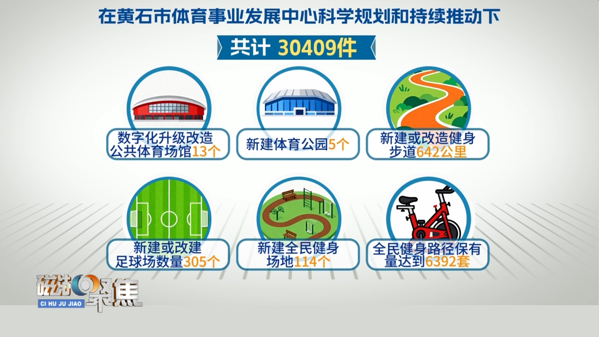“十四五”以来,在黄石市体育事业发展中心科学规划和持续推动下,数字化升级改造公共体育场馆13个,新建体育公园5个,新建或改造健身步道642公里,新建或改建足球场数量305个,新建全民健身场地114个,全民健身路径保有量达到6392套,共计30409件。 截止2024年, 县(市、区)、乡镇(街道)、行政村(社区)三级公共健身设施实现全覆盖。