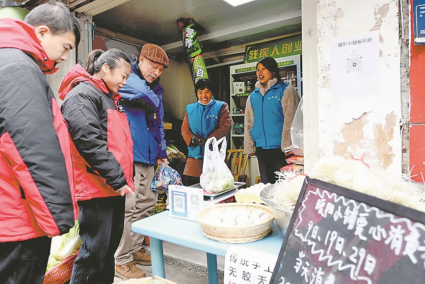 12月23日,铁路大院居民在“暖阳小铺”挑选新鲜蔬菜。铁路社区阳光家园为切实拓宽残疾人就业创业渠道,打造“暖阳小铺”创业就业平台,售卖助农、助残的绿色产品。