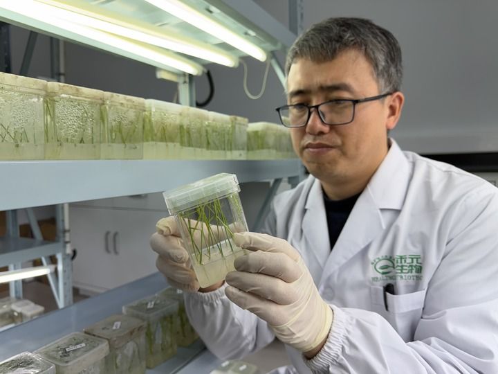 12月12日,禾元生物研发项目高级总监董亮亮在实验观察稻苗状态。(新华每日电讯记者熊琦摄)